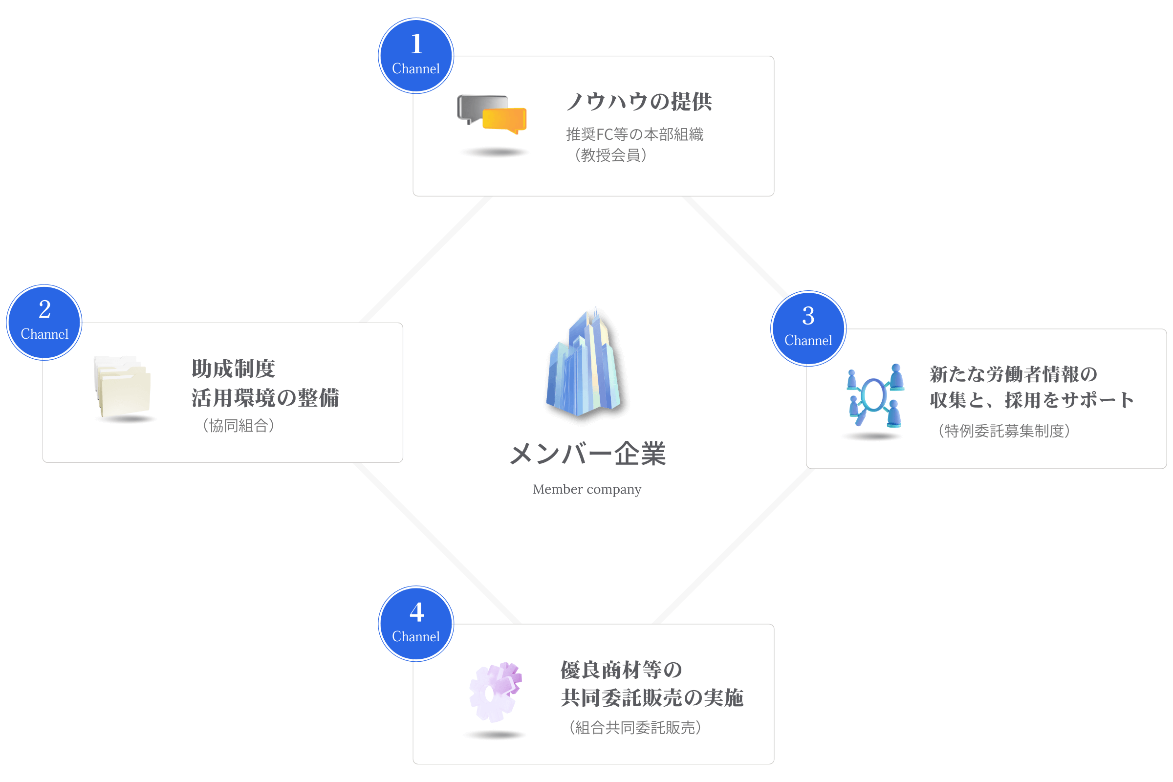 まちのちから合同事業協同組合(まち協)は、JASFA会員の受託販売商材の販路開拓支援を具体化するために設立された国土交通省認可の協同組合です。 「まちのちから合同事業協同組合」では、協業会員の取り扱う先進の商材、製品、技術、システム(以下商材等という)の販売促進を支援する共同事業方法を整備しており、協業会員の商材等販売促進のための指導、助言活動を行っております。