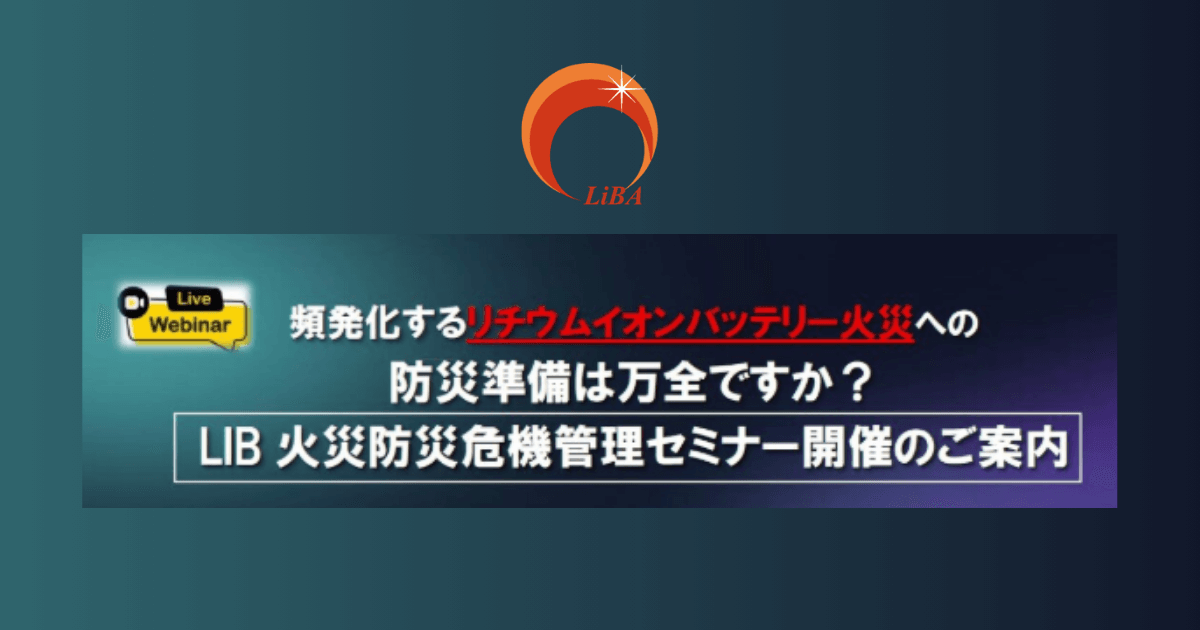 LIB 火災の危険性、及び品質・消火効能検査機関として設立された「社団LiBA」により、頻発するLIB火災に対処できる消火製品の性能・成分・消火効果を検査し、効能公証を受けた製品を公開!事業所・ご家庭での専用消火減災機器の振興への取組を啓発することを目的として開催されます。